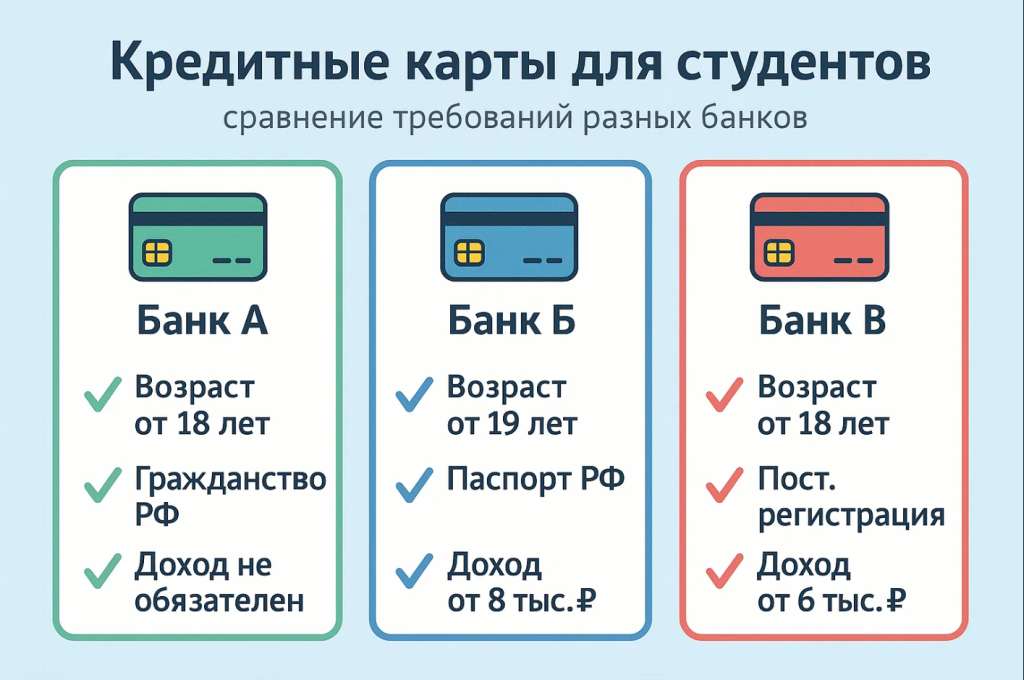Подходы к оценке платежеспособности студентов существенно различаются. Сбербанк устанавливает минимальные требования к доходу или предлагает оформить кредитную карту с поручительством родителей, что расширяет возможности получения более высокого лимита.